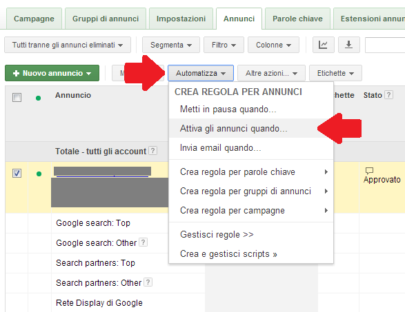 Clicca su Automatizza, lì troverai la sezione Creare Regola per Annunci. Selezionando Attiva gli annunci quando ti si aprirà questa finestra: