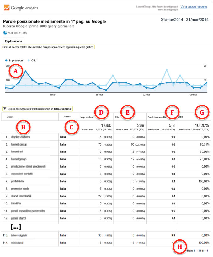 - H. Righe: il numero di righe (nell’esempio 114) rappresenta il numero di posizionamenti in prima pagina di Google ottenuti dal sito nel periodo di analisi specificato (nel report il mese appena trascorso)