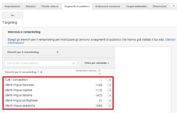 Per impostare gli elenchi di remarketing per campagne di ricerca Adwords, entra sul tuo gruppo di annunci e fai click su Segmenti di Pubblico. Clicca su +REMARKETING e seleziona Elenchi per il remarketing dalla sezione Targeting.